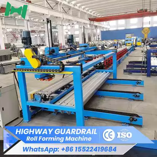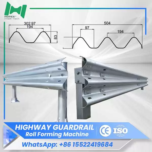 The Highway guardrail roll forming machine for sale is a specialized equipment designed to produce high-quality W beam and thrie beam guardrails used for road safety barriers. Manufactured by HOPEX, this machine ensures high precision, stability, and efficiency through its advanced forming technology and robust construction. It adopts an automatic decoiler, leveler, punching system, roll forming stations, and cutting unit to achieve smooth and accurate profiles. The PLC control system allows easy operation and adjustment, ensuring consistent performance and minimal waste.