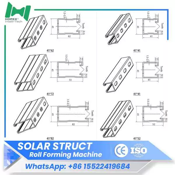 The HOPEX photovoltaic bracket roll forming machine is specifically engineered for producing steel or aluminum profiles used in solar energy mounting systems. This advanced production line integrates decoiling, leveling, punching, roll forming, and cutting into one continuous process, ensuring precise dimensions and high efficiency. Equipped with PLC control and touchscreen operation, it allows operators to adjust profile sizes and punching layouts easily. The servo feeding system guarantees accurate length control, while hydraulic cutting ensures clean, burr-free edges. Suitable for galvanized steel, aluminum, and stainless steel, the machine delivers corrosion-resistant and durable profiles ideal for outdoor photovoltaic installations. Its modular structure and quick-change roller design minimize downtime and enhance production flexibility. With stability, precision, and automation, the HOPEX photovoltaic bracket roll forming machine provides an efficient and reliable solution for solar mounting manufacturers.