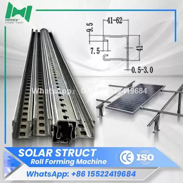 The HOPEX strut channel machine is a high-performance roll forming solution engineered for manufacturing solar mounting support channels with exceptional precision and consistency. Designed to handle multiple profile specifications—including 41×41, 41×52, 41×62, and 41×72—it provides outstanding flexibility for diverse photovoltaic structure applications.